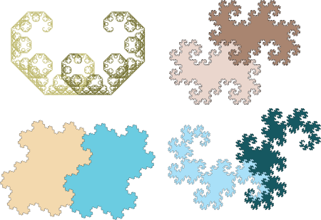 Interesting 2-reptiles, from the top left clockwise: Levy Dragon, Twindragon, Heighway dragon and Tame twindragon.
