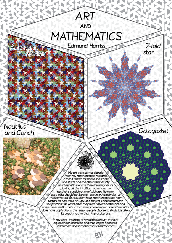 My art work comes directly from my mathematics research, in fact it is hard for me to see a clear line where one starts and the other finishes. My mathematical work is therefore very visual, playing off the intuition I gain from the aesthetic considerations in pictures. However, aesthetics should not be seen as something foreign to mathematics. In fact you will often hear mathematicians refer to work as `beautiful’ or `ugly’. In a subject where results can see practical use years after they were proved, aesthetics and taste are essential tools. In fact, even when an area of mathematics does have applications, the reason people choose to study it is often its beauty, rather than its practical use.