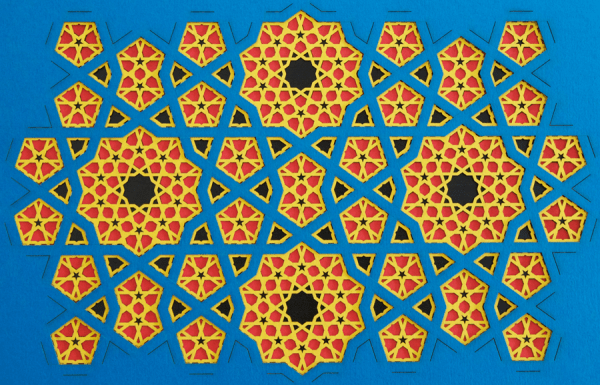 Marc Pelletier is a geometric artist, one of the visionaries behind the amazing Zometool system and the designer and builder of 120-cell models including one given to John Conway at Princeton and one at the Fields institute (given on the occasion of Coxeter’s 95th birthday). More recently he has been working on Islamic tiling patterns, drawing on the work of Jay Bonner, an expert on the geometric art of the Middle East. Marc has created an elegant and general system to generate such tilings with fine control over the symmetry and structures that come out. Here are a couple of sample designs. Marc, Chaim Goodman-Strauss and I were discussing the methods and how they can be put into a mathematical framework.