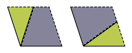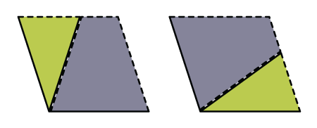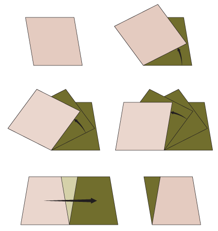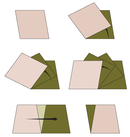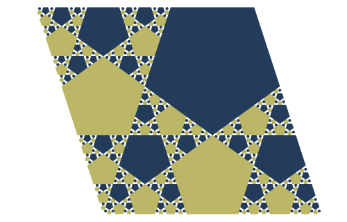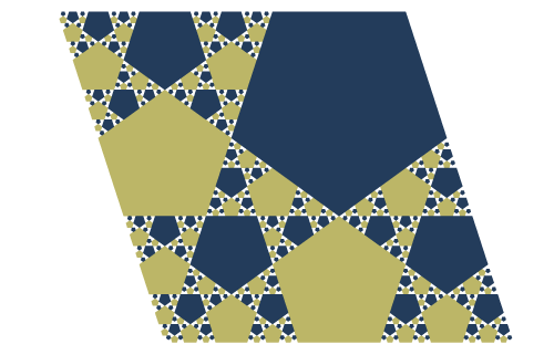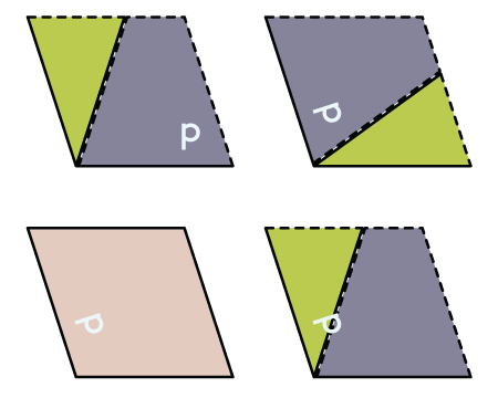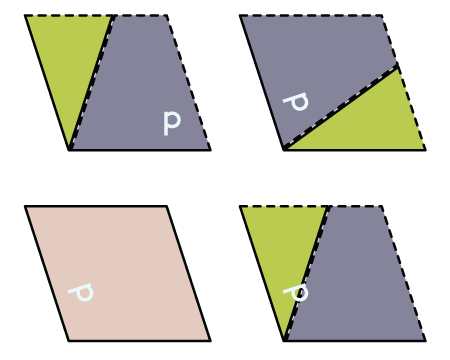 A simple, classic puzzle is to give two shapes and ask if there is a way to cut one up so the pieces can be rearranged into the other. This game might seem to become silly if both shapes are the same;  if we insist that the new arrangement must be different the game becomes interesting again. Think about it, can you come up with ways to cut up a square so that the pieces can be formed into two different squares? Here is an example, not with a square, but with a rhombus:Having the same shape has an advantage. Think about the letter p below, it is part of the blue trapezium, when we rearrange the tiles the p moves with the shape. As the two shapes are the same we can think of this new p within the original rhomb. We can now repeat the process as many times as we want. In this case, it might be a little unsatisfying, however, as the next step for our p would cut it into two different pieces, as it lies on the edge. So where is it safe to put a p so that it will never get cut up? To answer this we have to follow the cutting lines, and a beautiful pattern emerges:The p would be safe within any of the pentagons, but if it crosses any of the edes it will, eventually be cut apart.