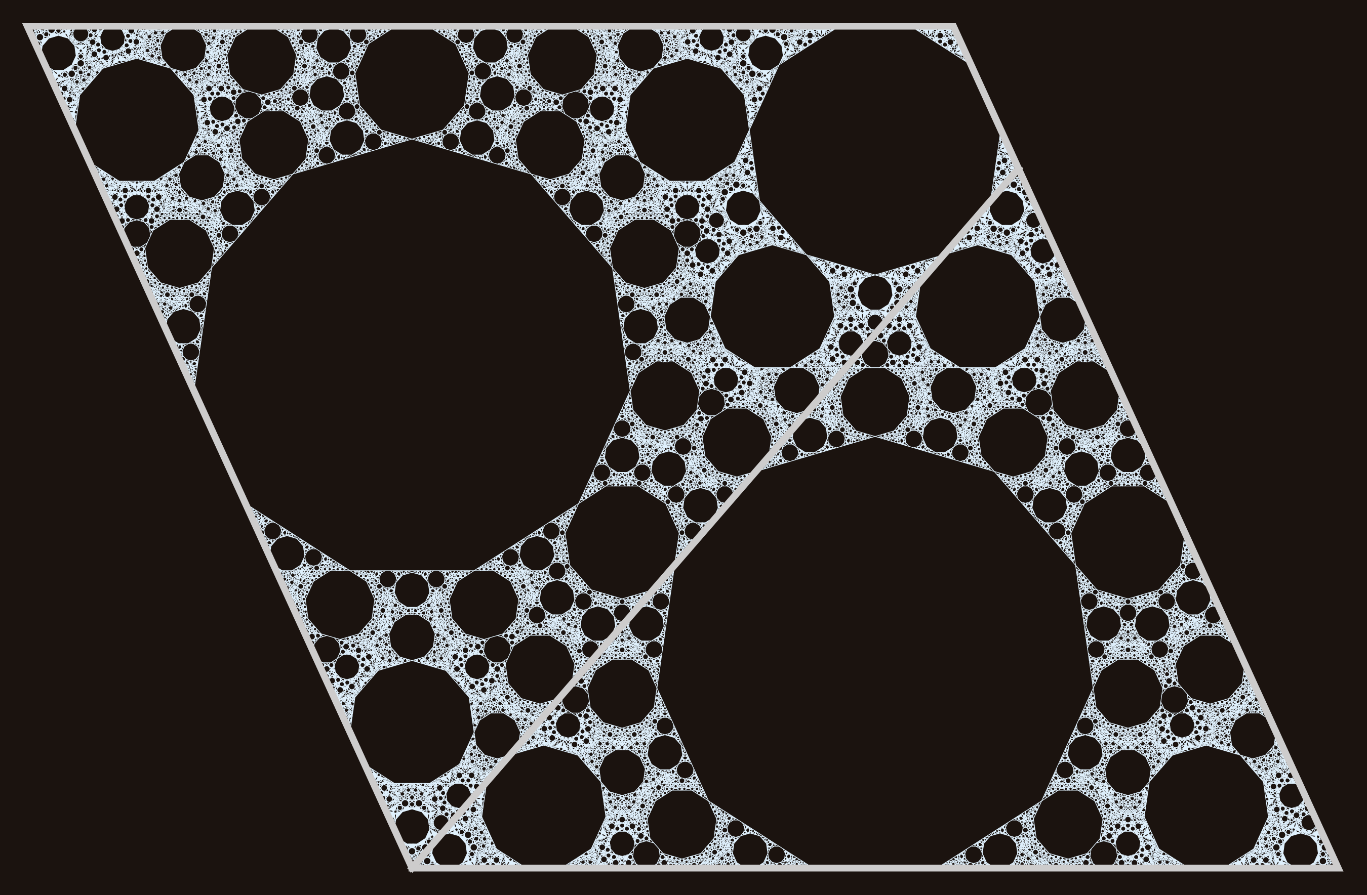 As you might have guessed from my preoccupations part of my interest in these systems is the pretty images that they produce; this system is particularly rich. This leads to the image at the top. You can take any rhombus and cut it up in a similar way. Take any rhomb (as shown below) and rotate until the side of the rhomb lines up with the top. This will leave a triangle and a trapezium that can be moved back on top of the original rhomb:Additionally this gives a system where the rotation on the two parts is the same, just around different points. You have to be a little careful, but you can use this to give a system for any angles. For any of these systems we can ask the question: Where is it safe to write p? Every angle gives a different pattern, and tiny changes in the angle leads to large changes in the pattern, however the patterns do relate to one another in some ways, as you can see in this video: